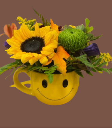 An assortment of Fall flowers beautifully arranged in this smiling yellow mug. Quantities are limited . 10″X10″