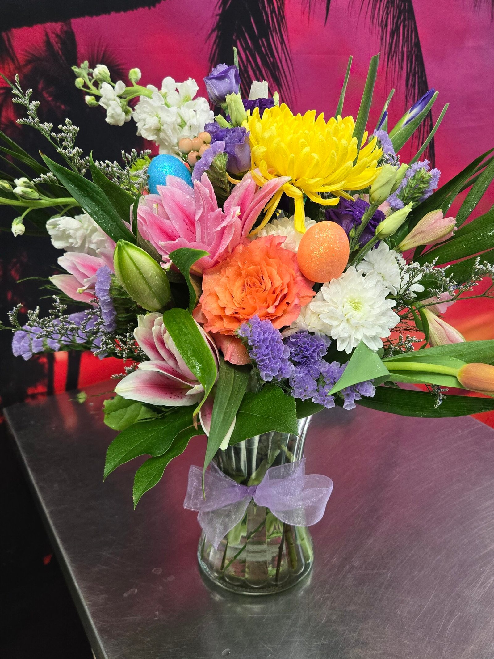 A mix from Designer’s choice. Pastel’s Spring flowers like iris, tulips, fuji, gerberas, lilies just to mention creating a rainbow of color. Comes in a vase. 17 inches tall x 13 inches wide