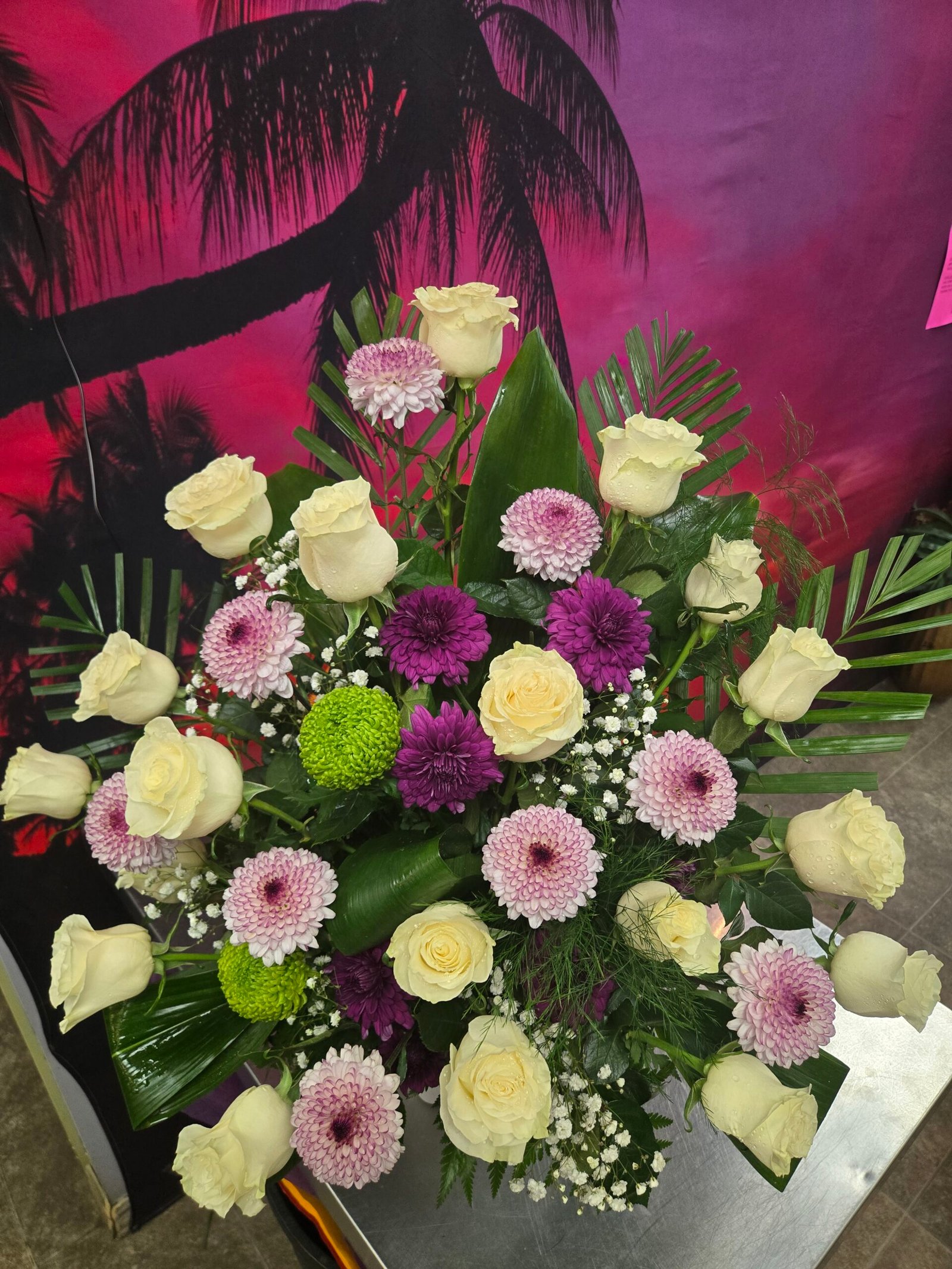 Beautiful tribute with Mondial Italian roses, mauve and purple mums with a touch of green cremon. we added an exotic Greenery and to soften it with some Babies breath. 30″tall x 27″wide