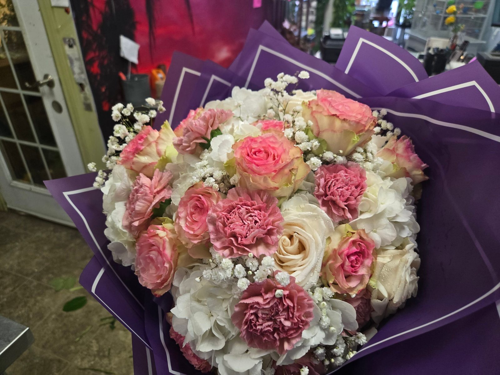 Beautiful Hand tied bouquet of Esperance roses, White Hydrangea, and pink carnations filled with Babies Breath and a couple of vandella roses wrapped with special paper. Must be ordered in advance. No same day delivery or pick up. 20 Inches across