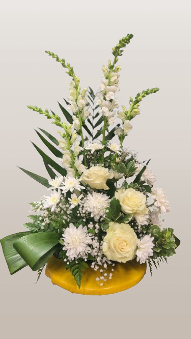 An all white arrangement with Snapdragons , Roses and Baby’s breath. 25″ Tall X 18″ Wide