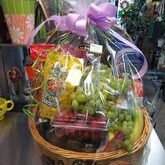 Includes: fruit, nuts, snacks, candy, chocolate, pretzels, and more! The items in our food baskets are specially bought, prepared, and arranged by Michael, the designer.